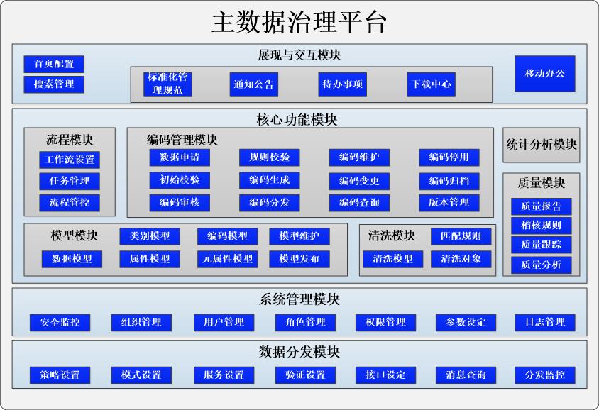 主数据平台以钢铁行业主数据为研究对象,打造钢铁主数据标准体系,包括六大主题域十三类主数据,主要从组织、人员、供应商、客户、设备管理、产品、中间产品、原辅料、能源、副产品、计量单位、系统标识主数据及涉及的信息系统等类型建立主数据体系,标准体系包括主数据标准基础、主数据分类标准、主数据保障体系 、主数据质量标准、主数据安全标准、主数据应用标准等。